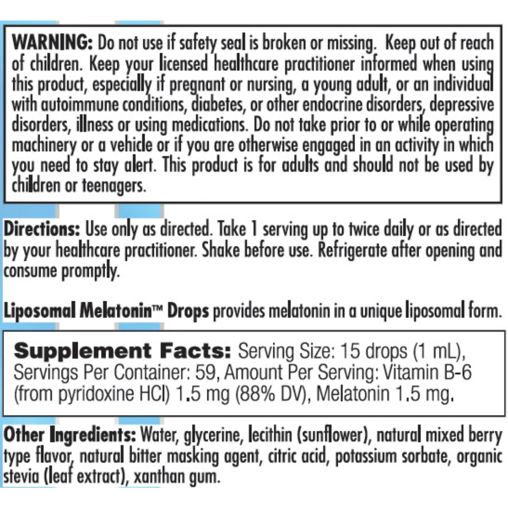 Each serving contains 1.5 mg melatonin and 1.5 mg vitamin B6 in a unique liposomal liquid form for flexible dosing and optimal absorption* Clinical applications: